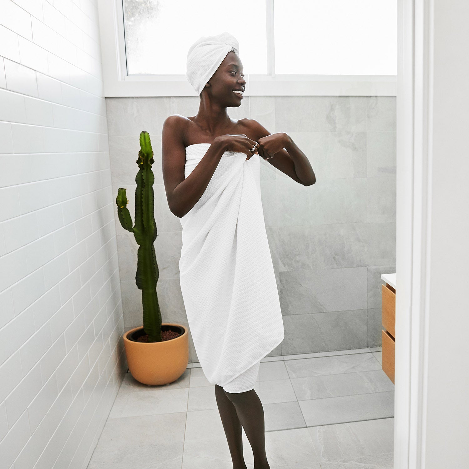 Yes, it really dries you. Our DryQ™ waffle fabric absorbs up to twice its weight in water, so it’s super absorbent while still drying you quickly, without that soggy towel feeling at the end.