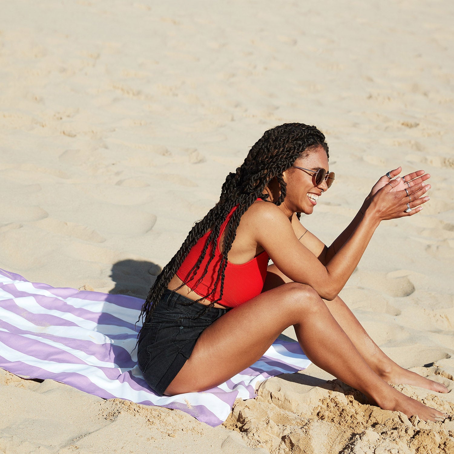 Our towels are made from 100% recycled materials using our unique DryQ™ fabric. Unlike cheaper microfiber towels, ours are super soft on your skin with no scratchy feel. The loop free design means sand won’t stick (even wet sand), and it won’t fray over time. Plus, our iconic pouch lets the towel pack down incredibly small, making it perfect for suitcases or backpacks.