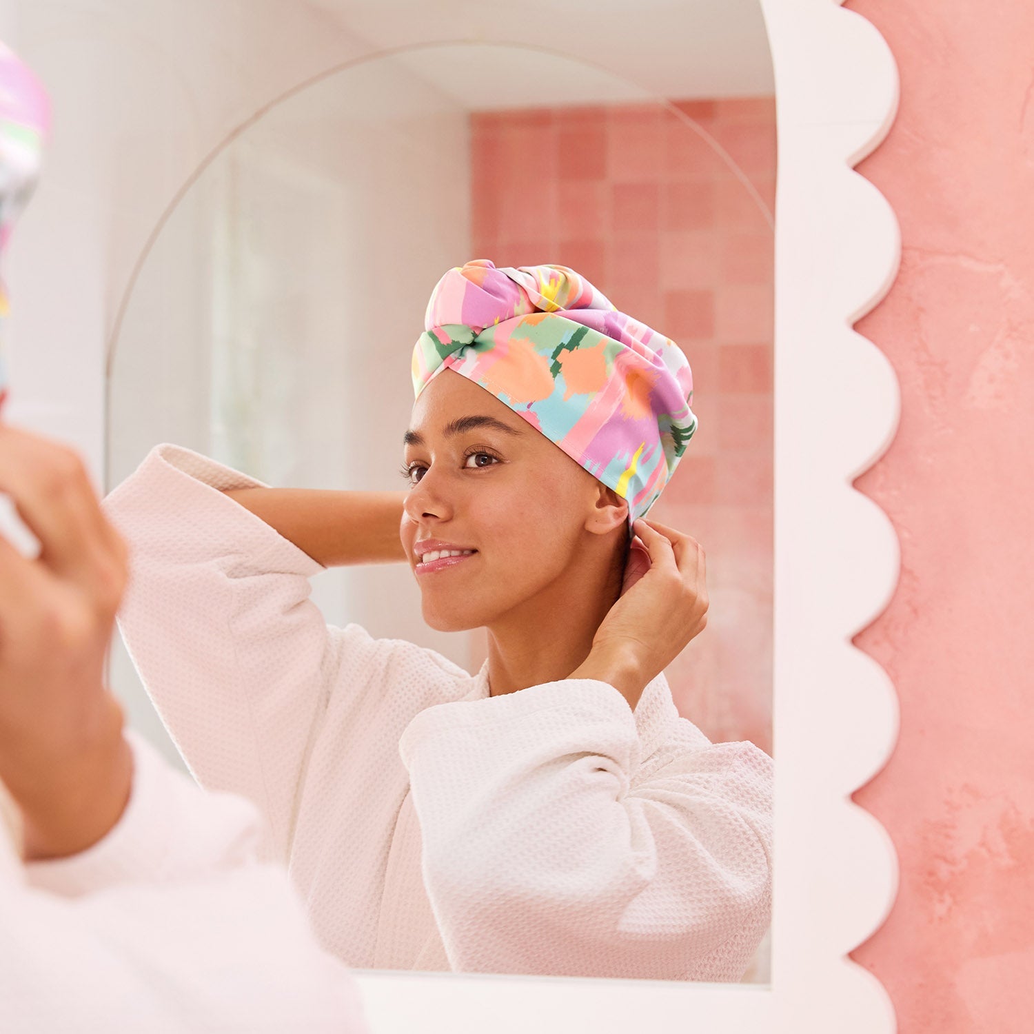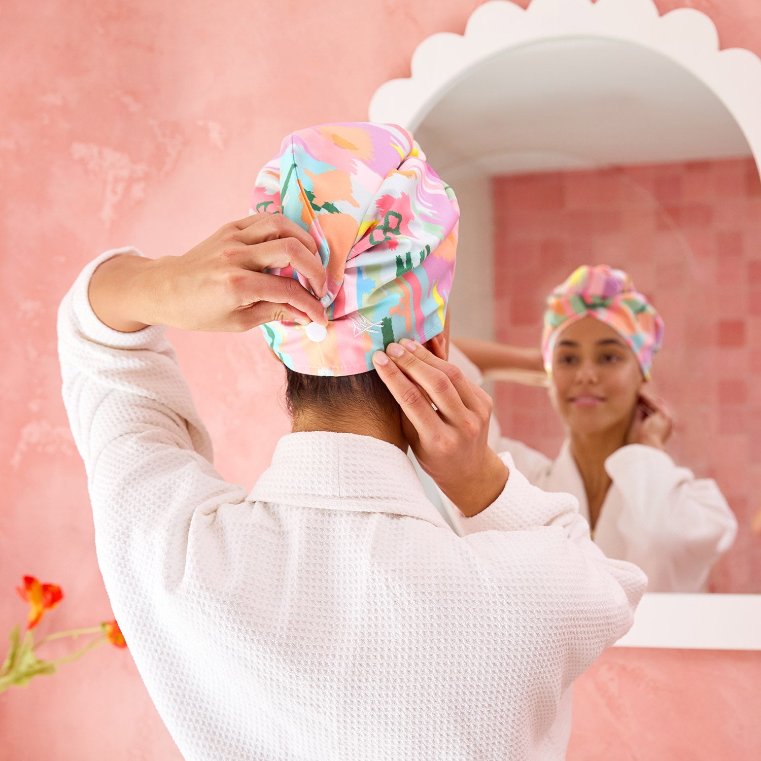 Made from our premium recycled DryQ™ fabric, it’s lightweight (no more neck pain), super absorbent, and soft on hair. The wrap and button design keeps it securely in place, so you can get on with your routine while it works its magic. Loopless fabric creates less rubbing, less frizz, and happier hair all round.