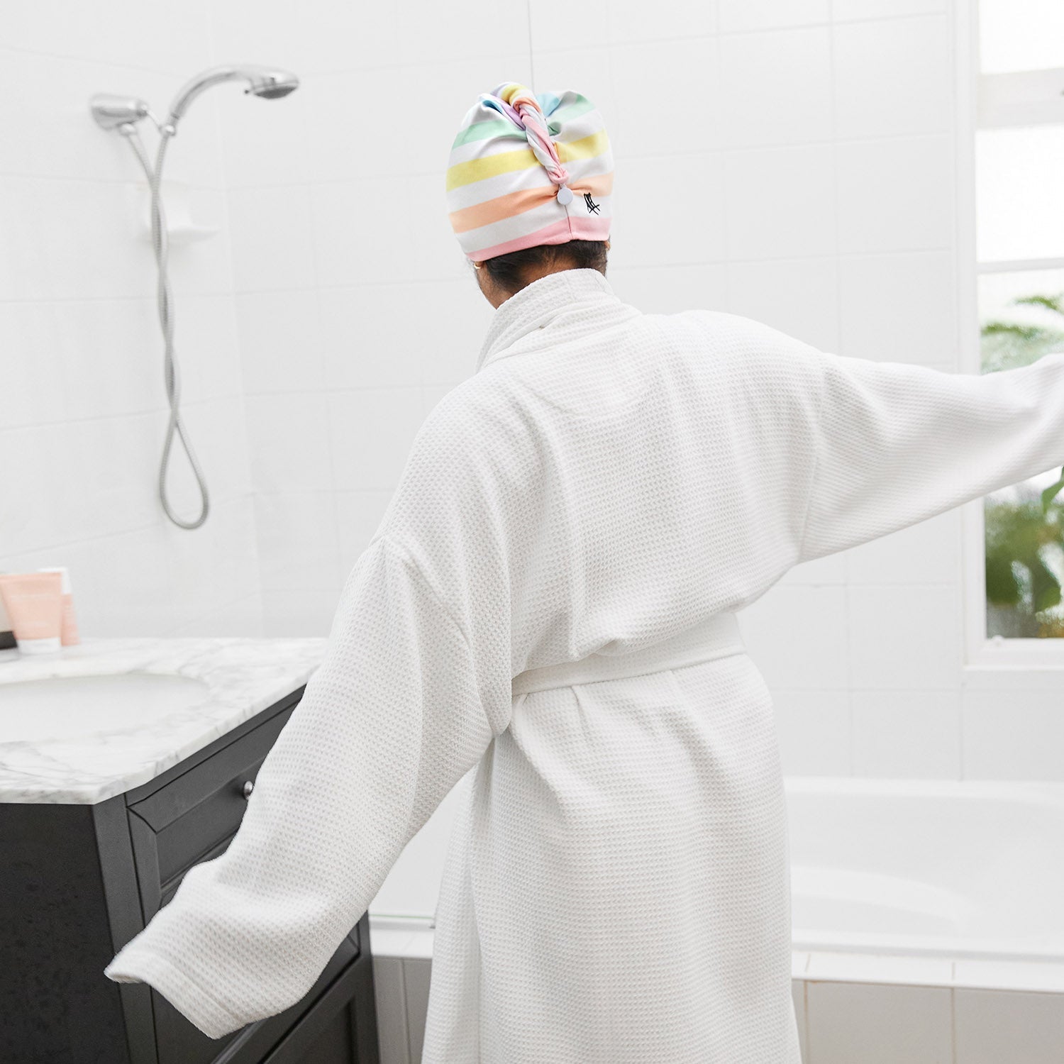 Hergestellt aus unserem hochwertigen recycelten DryQ™-Gewebe, ist es leicht (keine Nackenschmerzen mehr), super saugfähig und sanft zum Haar. Das Wickel- und Knopfdesign hält es sicher an Ort und Stelle, so dass Sie sich Ihrer Routine widmen können, während es seine Wirkung entfaltet. Das schleifenlose Gewebe sorgt für weniger Reibung, weniger Frizz und rundum glücklicheres Haar.