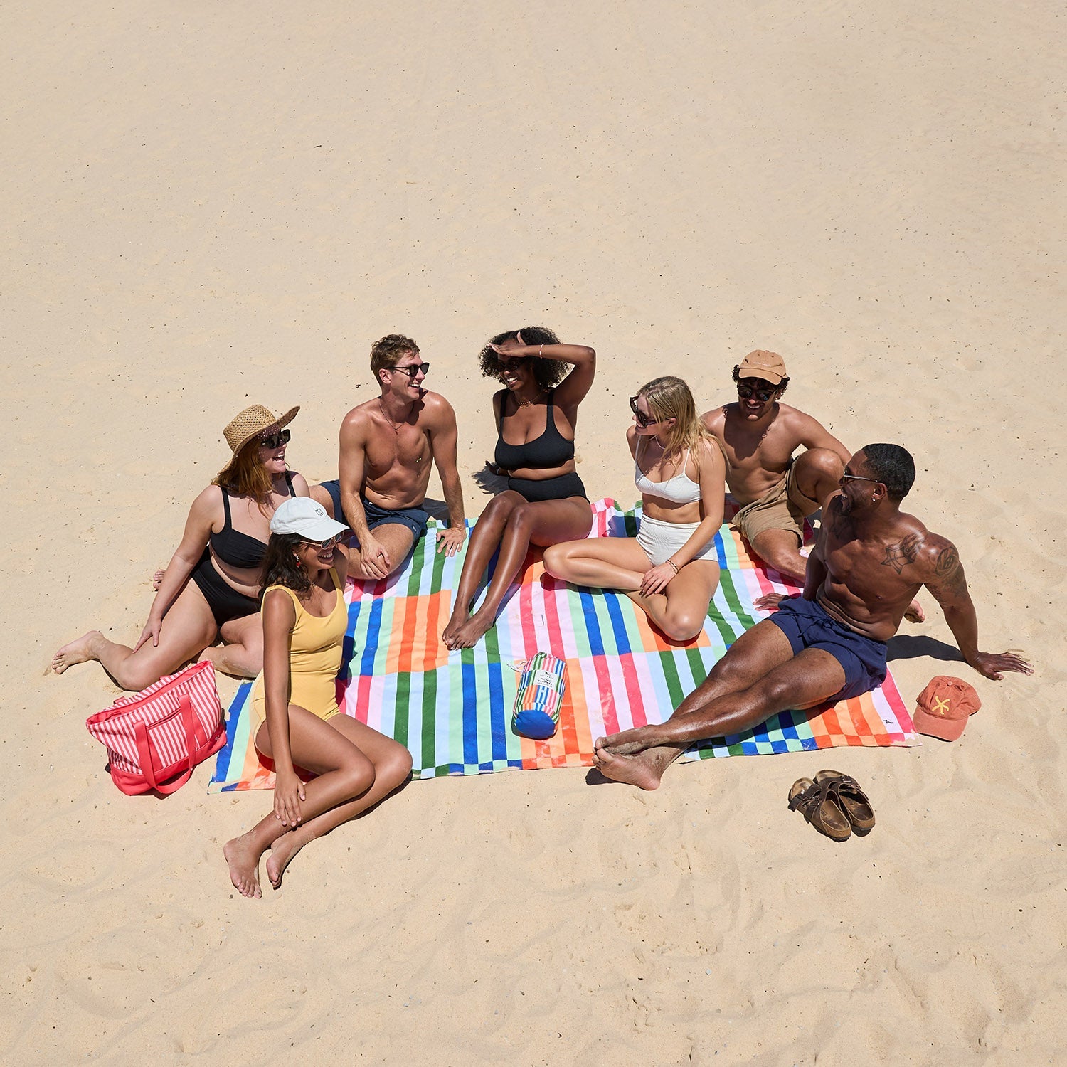 Die Picknickdecke für gelungene Ausflüge. Groß genug, um sich bequem auszubreiten, egal ob Sie im Park picknicken, an den Strand fahren oder sich einen Platz auf einem Festival sichern. Mit einem Loch in der Mitte, damit Ihr Sonnenschirm Sie vor der Sonne schützt.